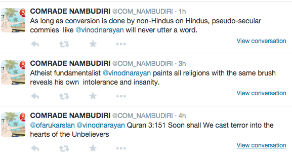 His twitter handle is com_nambudiri and which is a handle only people who know me personally from college (REC) times might use… He probably went to college with me, or worked with me or is one of my relative or a friend from my town or state who is quite annoyed with me, for my liberal opinions (sorry pseudo-liberal in his words) . There is a high chance the person is in my FB friend list as well… and hence using twitter for anonymity 🙂 I also suspect that he is not showing his true identity because he might be quite close to me or at least he thinks so…. I would not deny that because I have a lot of very close friends who completely disagree with me on many topics…