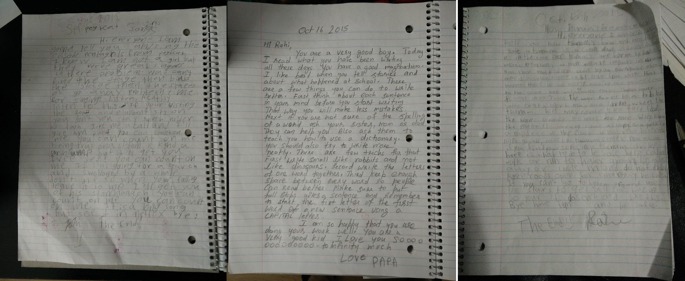 Over the past 2 months I have been asking my 8 year old to write a page every day. Anything he wants… and he does that regularly. His favorite topic is Tsunami, Volcanoes and earthquakes and how to be safe when that happens, so most of his writing has to do with it. With other stuffs like TV shows and even some of his thoughts