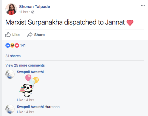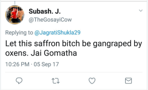 By evening I had read some more and what baffled me was not the reference of Hindu Terror when assailants are unidentified, but the shamelessness in which some Nationalists had started posting to say Gauri deserved it. This includes people like the Nationalist Journalist Jagrati Shukla who tweeted